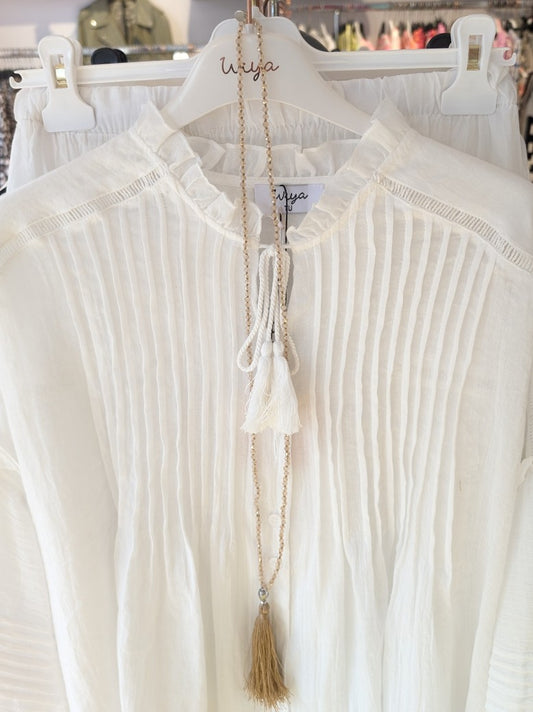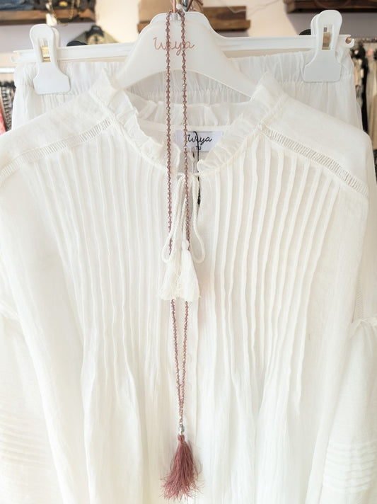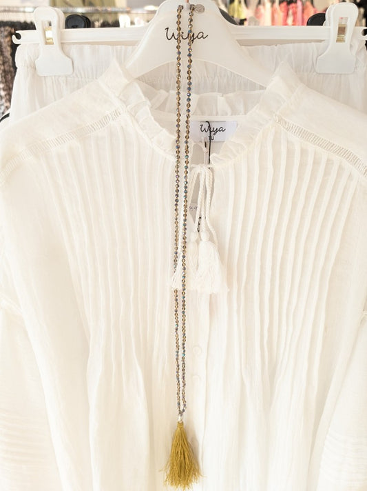 Kette Boho Edelstahl mit Kristallsteinen Buddha Kopf glänzend 90cm lang in Beige mit Quast in Gold SSt Bijoux 8112592
